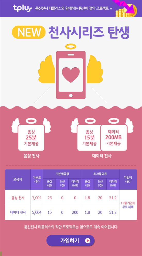 [아시아경제 권용민 기자] 태광그룹 계열 한국케이블텔레콤(KCT)이 지난 1월 실시한 천사요금제 이벤트에 이어 천사시리즈 요금제를 13일 출시한다.천사시리즈 요금제는 '음성천사'와 '데이터천사' 2가지가 있다. 음성천사 요금제는 월 기본료 3004원에 음성 25분을 기본 제공해 수신 위주의 음성통화 사용자에게 적합하다. 데이터천사 요금제는 월 기본료 5004원에 음성 15분, 데이터 200MB를 기본 제공한다. 카톡 등 일부 SNS 서비스만을 이용하는 데이터 사용량이 적은 사용자에게 최적인 상품이다.KCT는 데이터천사 요금제의 경우 타통신사 요금 2만2860원(기본료 1만1000원+통화료 1620원 + 데이터 사용료 1만0240원) 대비 78% 가량 저렴하고 음성천사 요금제(기본료 3004원)도 타통신사(기본료 1만1000원 + 통화료 2700원) 대비 78% 저렴하다고 설명했다.해당요금제는 의무약정기간이 없으며 11월 중 가입할 경우 6개월 이상 사용조건으로 가입비(2만4000원) 면제혜택이 제공된다. 또 단말기 구매가 필요 없는 유심(USIM) 전용상품으로 서비스 가입 후 배송 받은 유심(USIM)을 단말기에 넣어 바로 사용할 수 있다.티플러스 음성천사와 데이터천사 요금제 가입 및 자세한 안내는 티플러스몰(www.tplusmall.co.kr)을 통해 확인 가능하며 개통 문의는 콜센터(1877-9114)로 전화하면 된다.이호식 KCT MVNO사업팀장은 "KCT는 고객 관점에서 실속 있는 요금제를 지속적으로 출시하여 고객의 통신요금 절감에 힘쓸 것"이라고 전했다.권용민 기자 festym@asiae.co.kr<ⓒ세계를 보는 창 경제를 보는 눈, 아시아경제(www.asiae.co.kr) 무단전재 배포금지>