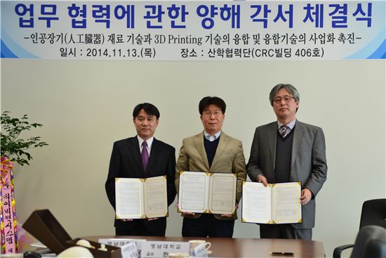 영남대와 인공장기 재료·바이오 메디컬 3D프린팅 기술 개발 추진키로[아시아경제 김유리 기자] 하이비젼시스템은 지난 13일 인공장기 재료 기술과 3D프린팅 기술의 융합과 융합 기술의 사업화 촉진을 위해 영남대와 양해각서(MOU)를 체결했다고 14일 밝혔다.하이비젼시스템은 2년 연구개발을 통해 자체 설계한 3D프린터 '큐비콘'의 상용모델 '큐비콘 싱글'을 지난 달부터 양산 판매 중이다. 하이비젼시스템은 영남대와의 MOU를 계기로 인공장기 재료 프린팅 기술을 개발할 계획이며, 이를 통해 바이오 메디컬 3D 프린팅까지 사업영역을 확대할 예정이다. 이번 산학협력은 대학의 연구개발 능력과 기업의 전문기술을 융합하는 차원에서 추진됐다. 기술 사업화 전문기업인 NICE아이피파트너(NIPP)의 주선으로 성사됐다. 신동원 NIPP 사장은 "영남대의 인공장기재료 연구는 성공 가능성이 높았고, 이를 사업화 하기 위해서는 기술력과 추진력을 갖춘 기업이 필요했다"며 "하이비젼시스템은 영상인식 및 메카트로닉스 응용 기술을 갖추고 장비분야에서는 세계 수준의 기술을 갖춘 기업이라 가장 적합할 것으로 판단했다"고 말했다. 인공장기 재료기술을 연구개발해 온 한성수 영남대 나노메디컬유기재료공학과 교수는 "그동안 연구해 온 인공장기재료를 3D프린터를 통해 적층으로 쌓아 인공장기를 만들 계획"이라며 "이를 통해 새로운 산업 생태계를 창조하게 될 것"이라고 말했다.인공장기는 인체에 무해한 고분자 물질을 소재로 환자의 장기 형태에 맞게 3D프린터로 출력한 후 개개인의 고유한 인체 장기의 세포를 주입·배양해 실제 장기와 유사하게 만들 수 있다. 본인의 세포로 만들어 거부 반응 등 부작용이 없고 하나만 필요하기 때문에 3D 프린터의 활용이 늘어날 것으로 예상됐다. 이번 MOU를 통해 영남대는 인공장기용 3D프린팅에 적합한 고분자 소재를 개발·제공하고 하이비젼시스템은 3D프린터 큐비콘 개발 과정에서 쌓은 자체 기술력을 접목해 인공장기 출력을 지원한다.최두원 하이비젼시스템 대표는 "3D프린터 시장은 매년 20%이상 성장하고 있지만 3D프린터의 활용도를 높이기 위해서 더욱 다양한 재료 개발이 시급하다"며 "인공장기는 냉각하는 방식으로 프린팅해야 하기 때문에 영남대와 협력을 통해 다양한 소재에 적합한 프린팅 기술 개발에 힘쓰겠다"고 말했다.김유리 기자 yr61@asiae.co.kr<ⓒ세계를 보는 창 경제를 보는 눈, 아시아경제(www.asiae.co.kr) 무단전재 배포금지>