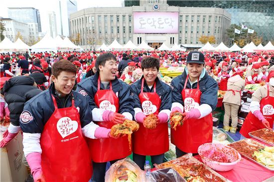 [아시아경제 나석윤 기자] 프로야구 두산이 14일 서울광장에서 열린 '2014 사랑의 김장 나누기' 행사에 참가했다. 서울시와 서울 사랑의 열매(서울시 사회복지공동모금회)가 함께 진행한 이번 행사에는 외야수 김현수(26)와 투수 이현승(31), 노경은(30), 오현택(29)이 참가해 김치를 담그며 사랑 나눔을 실천했다. 아울러 이번 행사에는 시민 자원봉사자 3000여명이 참가해 총 6만1500포기 김치를 담갔다. 두산 구단은 앞으로도 팬들의 성원에 보답하기 위해 '사랑의 좌석 초청행사', '재능기부' 등 사회공헌활동을 꾸준히 진행해 나갈 예정이다.나석윤 기자 seokyun1986@asiae.co.kr<ⓒ세계를 보는 창 경제를 보는 눈, 아시아경제(www.asiae.co.kr) 무단전재 배포금지>