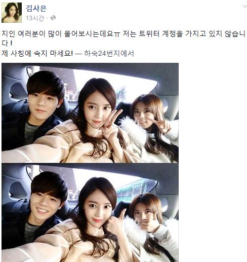 '슈주' 성민과 결혼 앞둔 김사은…"트위터 사칭 속지 마세요" [아시아경제 온라인이슈팀] 그룹 슈퍼주니어 멤버 성민(이성민)과 결혼을 앞둔 뮤지컬 배우 김사은이 SNS에 경고의 글을 남겼다. 15일 김사은은 자신의 페이스북에 "지인 여러분이 많이 물어보시는데요. 저는 트위터 계정을 가지고 있지 않습니다! 제 사칭에 속지 마세요"란 글과 함께 사진을 게재했다. 이와 함께 현재 MBC에브리원 '하숙 24번지'에서 출연하는 제국의아이들 김동준, 타이니지 도희와 촬영 중 찍은 사진이 눈길을 끌었다. 사진 속 김동준과 도희, 김사은은 미소를 지은 채 친근한 모습으로 카메라를 응시하고 있다. 한편 성민과 김사은은 내달 13일 오후 6시 서울 역삼동에 위치한 라움에서 결혼식을 올린다. 같은 날 두 사람의 웨딩 컷이 공개돼 네티즌들의 뜨거운 관심을 받고 있다. 온라인이슈팀 issue@asiae.co.kr<ⓒ세계를 보는 창 경제를 보는 눈, 아시아경제(www.asiae.co.kr) 무단전재 배포금지>