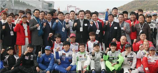 이낙연 전남도지사가 16일 오전 영암 코리아인터내셔널서킷(KIC)에서 열린 2014 전라남도 모터스포츠 페스티벌대회에 참석, 참가 선수들과 기념촬영을 하고 있다. 사진제공=전남도