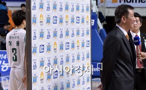 경기에서 패한 전주 KCC 허재 감독이 가림막 뒤로 '아들' 허웅을 등진 채 인터뷰를 하던 중 웃어보이고 있다.[전주=김현민 기자]