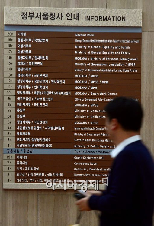 [아시아경제 백소아 기자] 17부 5처 16청으로 정부조직이 개편된 가운데 19일 서울 세종로 정부서울청사 로비에 부착된 안내판에 명칭이 바뀐 행정자치부와 새롭게 신설된 국민안전처가 눈에 띤다.백소아 기자 sharp2046@asiae.co.kr<ⓒ세계를 보는 창 경제를 보는 눈, 아시아경제(www.asiae.co.kr) 무단전재 배포금지>