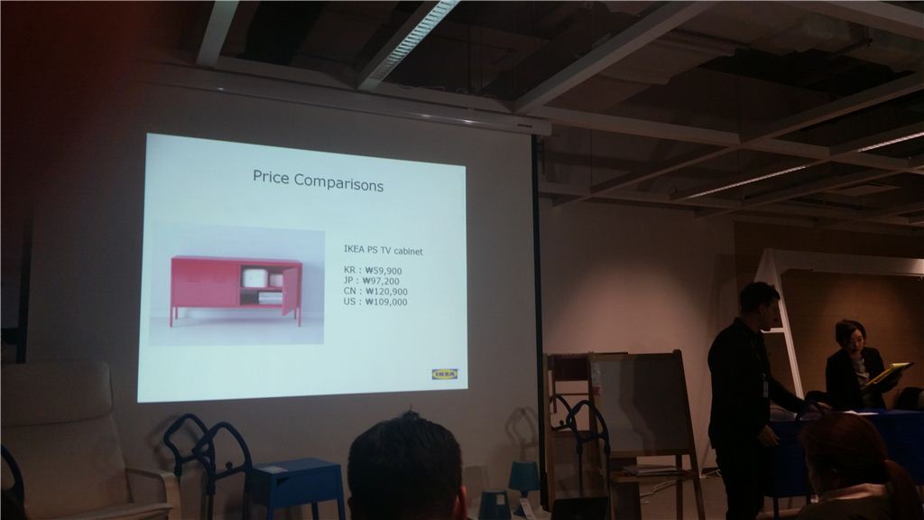 앤드류 존슨 매니저(오른쪽 두번째)가 PS캐비넷 가격을 비교 설명하고 있다. PS캐비넷의 경우 국내에서는 5만9900원에 판매하지만 일본은 9만7200원, 중국은 12만900원, 미국은 10만9000원으로 국내가 4국 중 제일 저렴하다.