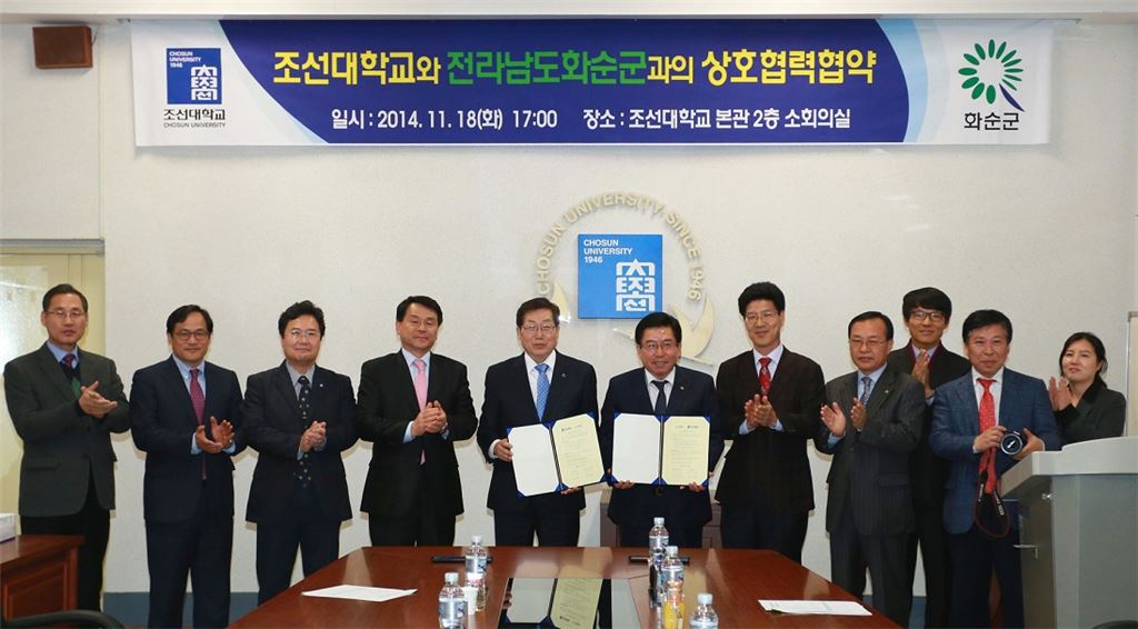 [구충곤 화순군수와 서재홍 조선대 총장 및 양 기관 간부들이 협약 체결 후 기념촬영을 하고 있다.]