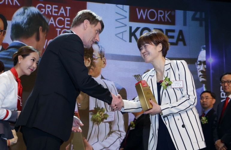 맥도날드 인사팀 이은영 상무(오른쪽)가 ‘2014 대한민국 여성이 일하기 좋은 기업 대상’ 시상식에서 독일 GWTP(Great Place To Work) 프랭크 하우저 CEO 로부터 상을 수여 받고 있다.<br /> <br />