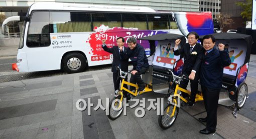 [아시아경제 백소아 기자] 20일 서울 광화문 청계광장에서 열린 '찾아가는 규제개혁버스' 제막식에서 (왼쪽부터)김경만 중소기업중앙회 정책개발본부장, 강영철 민관합동규제개선추진단장, 박형서 대한상공회의소 회원사업본부장, 한상원 민관합동규제개선추진단 부단장이 규제개혁 인력거 퍼포먼스를 하고 있다. 현장중심 규제개혁을 실천하기 위해 마련된 '찾아가는 규제개혁버스'는 전국순회 형태로 14개 지역에서 '찾아가는 규제개선 간담회'를 운영한다.백소아 기자 sharp2046@asiae.co.kr<ⓒ세계를 보는 창 경제를 보는 눈, 아시아경제(www.asiae.co.kr) 무단전재 배포금지>