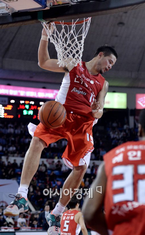 [아시아경제 이종길 기자]서울 SK가 울산 모비스의 연승 행진에 제동을 걸었다. 잠실학생체육관에서 20일 열린 2014-2015 KCC 프로농구 정규리그 맞대결에서 77-68로 이겼다. 시즌 열두 번째 승리(4패)와 함께 5연승을 질주, 리그 단독 2위로 부상했다. 열한 경기에서 연승에 마침표를 찍은 선두 모비스(14승3패)와 격차는 1.5경기다. 승부는 4쿼터에서 갈렸다. SK는 종료 5분20초 전 김민수가 덩크슛을 꽂아 66-66 동점을 만들었다. 역전도 그의 손에서 비롯됐다. 종료 2분53초를 남기고 2점을 추가했다. SK는 이어진 공격에서 코트니 심스까지 공격 리바운드에 이은 골밑 득점을 성공시켜 승기를 잡았다. 마무리는 '해결사' 김선형의 몫이었다. 종료 1분16초를 남기고 3점슛을 넣어 점수 차를 순식간에 7점(73-66)으로 벌렸다. 모비스는 양동근이 바로 2득점했지만 다시 한 번 김선형에게 득점을 허용했다. 골밑 돌파에 이은 절묘한 레이업슛에 그대로 추격 의지를 잃었다.SK의 일등공신은 단연 김민수. 22득점 7리바운드로 내외곽에서 제 몫을 했다. 문경은 SK 감독은 "골밑에서 골을 넣는다는 점이 고무적이다. 특히 공격 리바운드가 인상적"이라며 "수비에도 적극적으로 참여하고 있어 팀에 큰 보탬이 되고 있다"고 했다. 김민수는 "내가 할 일은 애초 리바운드와 수비였다"며 "계속 경기를 하다 보니 익숙해지고 자신감이 생겼다"고 했다. 공격에 대해서는 "비시즌에 훅슛이나 포스트 플레이를 많이 연습한 보람을 느끼고 있다"고 했다.리카르도 포웰[사진=김현민 기자]