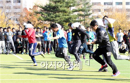 광주 북구청이 실시한 환경미화원 공개채용에 8명 모집에 남자 140명, 여자 12명의 총 152명이 지원, 19대1의 높은 경쟁률을 기록한 가운데 20일 문화근린공원 인조잔디구장에서 응시자들이 15kg의 모래주머니를 메고 50m달리기를 하고 있다. 사진제공=광주시 북구