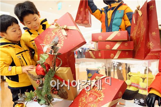 다가오는 크리스마스 시즌을 맞아 (주)광주신세계(대표이사 유신열)가 붉은색 바탕에 황금색으로 'Shinsegae LOVES Christmars' 글자와 눈꽃을 형상화한 쇼핑백과 상자 등 크리스마스 포장 패키지를 선보이고 있다. 사진제공=광주신세계