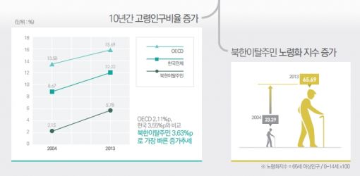 [아시아경제 박희준 외교·통일 선임기자]한국의 고령화가 심각하지만 북한에 비하면 새 발의 피 수준이다. 북한은 더 빠르다.25일 남북하나재단(이사장 정옥임0이 발표한 북한이탈주민 동계 시리즈 4호 고령화편에 따르면 북한 이탈 주민 사회는 남한 전체 보다 더 빠른 속도로 늙고 있는 것으로 나타났다.한국 사회는 2000년 65세 인구(노령인구)가 전체 인구에서 차지하는 비중이 7%를 넘는 '고령화 사회'에 진입했고 2017년에는 이 비율이 10%를 초과하는 '고령사회'에 들어가고 이어 2026년에는 이 비율이 20%를 넘는 초고령사회에 진입할 것으로 예상되고 있다고 재단 측은 전했다.65세 이상 고령인구는 2004년 8.67%에서 지난해 12.22%로 크게 증가했다. 이는 선진국 클럽인 경제협력개발기구(OECD) 평균이 13.58%에서 15.69%로 2.11%포인트 증가한 보다 더 가파른 속도이다.그러나 탈북민 중 고령인구 증가속도는 더 빠르다. 2004년 2.15%에서 5.78%로 3.63% 포인트 증가했다. 특히 14세 이하 인구에 대한 65세 이상 노인 인구의 비율인 노령화 지수는 2004년 23.29%에서 66%로 급상승했다.2004년과 견준 2013년 연령대별 인구는 10대와 20대, 30대는 낮은 증가율을 보인 반면, 40대는 9배, 50대는 8배, 60대 이상은 6배의 증가율을 보였다.북한 이탈주민 중 고령인구의 남한 생활은 고달프기 짝이 없다. 빈곤과 건강,고독 등 삼중고를 겪고 잇다. 60대 이상 탈북민을 대상으로 노년 생활의 어려움을 묻는 질문에 47.6%가 '경제적 어려움'을. 25.5%는 '건강문제' 7.8%는 '외로움과 소외감'이라고 답했다.60세 이상 탈북민의 월평균 소득은 102만4000원이고, 65세 이상 기초생활 수급자 비율은 70.9%로 일반 국민 6%에 비해 월등히 높다. 대다수가 정부 보조에 의존에 살고 있는 셈이다.이들은 여가 때 혼자 있는 경우가 많다. 50대 이상 북한 이탈주민은 주말이나 휴일에 '나홀로 여가활동'을 하는 비율이 30.9%로 매우 높다. 즉 셋 중 한 명은 혼자 지낸다는 뜻이다. 공연이 스포츠 관람, 여가시설 이용 등의 경험이 적은 것으로 나타났다.노후준비는 꿈도 못꾼다. 고령화 시대에 대비해 노후 준비를 하고 있다는 탈북민은 40.5%로 일반 국민(72.9%)에 비해 크게 낮다.정옥임 이사장은 "이 같은 통계로 볼 때 탈북민 고령인구 증가에 대한 지원책은 건강관리, 노후 소득과 일자리 제공, 심리안정과 노후준비 교육에 중점을 둬야 한다"면서 "취업 장려금 제도를 보완해 노령기 생활안정자금의 기초가 되는 저축이나 개인연금으로 적립되도록 하는 방안도 검토해볼 필요가 있다"고 제안했다.박희준 외교·통일 선임기자 jacklondon@asiae.co.kr<ⓒ세계를 보는 창 경제를 보는 눈, 아시아경제(www.asiae.co.kr) 무단전재 배포금지>