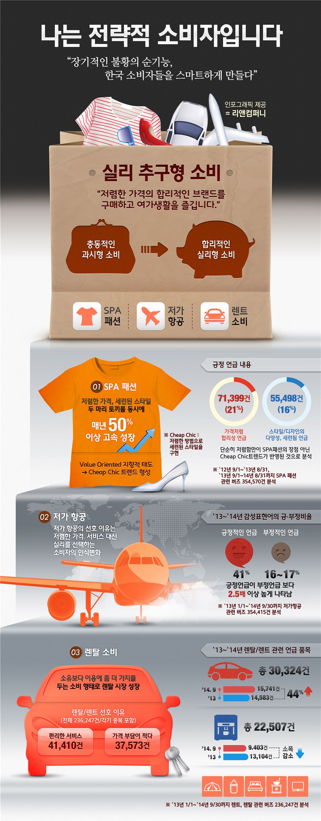 [아시아경제 김소연 기자]장기화된 불황 속 소비자들이 똑똑해지면서 실속과 실리를 따지는 소비패턴이 확산되고 있다. 이에 따라 SPA 패션이나 저가 항공, 렌트 소비 가 급성장하고 있다. 26일 SK플래닛 광고부문이 내놓은 '빅데이터 트렌드 리포트'에 따르면 체감경기 침체에 따라 소비패턴이 실리 추구, 적극적이고 능동적인 소비, 윤리적 소비 등 3가지 방향으로 변화하고 있는 것으로 나타났다. 먼저 실속형 소비가 늘어나면서 SPA패션의 경우 현재 8% 정도의 국내시장 점유율이 매년 50% 이상씩 성장해 조만간 30%대로 성장할 것으로 예측됐다. 소셜버즈 언급량을 보면 2012년 9월1일부터 2013년 8월31일까지 1년간 14만9573건이 언급된 것에 비해 이듬해인 2013년 9월~2014년8월31일까지는 20만4997건이 언급돼 37% 이상 증가했다. 또 언급량 뿐 아니라 선호도도 높아 저렴함, 합리성 등을 언급한 내용이 7만1399건으로 전체의 21%를 차지했다. 디자인의 다양성과 세련됨을 언급한 버즈도 5만5498건으로 전체의 16% 비중을 기록했다.저가항공의 급부상 역시 실속형 소비 패턴 덕분이다. 국토부 자료에 따르면 국내 저가항공의 국내선 이용객은 2010년 34.7%에서 올 상반기 49.9%로 확대됐다. 국제선도 2010년 점유율 2.5%에서 올 상반기 11.6%로 5배 급성장했다. 이 같은 관심은 소셜상에서 먼저 드러났다. 저가항공 관련 소셜 버즈 언급량은 지난해 월평균 1만5522건이 언급된 것에서 올 1~9월 동안 월평균 1만8684건이 언급돼 전년대비 21% 증가했다. 실제 시장 성장률(17.6%)와 비슷한 수준이다. 이외 렌탈 시장 역시 2006년 3조원 규모에서 2012년 약 10조2000억원 규모로 3.4배 성장했다. 국민 1인당 연간 20만원을 렌탈소비에 쓰고 있는 셈이다. 소셜상에서는 지난해부터 올 9월까지 렌트와 렌탈 관련 소셜버즈가 23만6247건이 검출됐는데 이중 긍정적인 언급이 지난해 45%, 올해 48%로 부정적 언급비율(13~14%)보다 3배 가까이 높았다. 버즈 분석 결과 소비자들은 렌탈/렌트를 선호하는 이유로 편리한 서비스(4만1410건), 가격 부담이 적다(3만7573건) 등을 많이 언급된 것으로 분석됐다. 또 최근 큰 이슈로 떠오른 '해외직구'는 적극적이고 능동적인 소비패턴의 변화를 가장 잘 대변한다. 국내외 해외 간 제품가격 차이가 지나치게 차이가 나는 상황에서 국내 소비자들은 판매자들에 대응하기 위한 수단으로 해외직구를 선택했다. 더 이상 기업들의 유통체계를 수동적으로 수용하지 않는다는 점을 단적으로 보여주는 것이다. 해외직구에서 가장 인기있는 품목이 해외 수입품이 아닌, 국내 가전사들의 TV라는 점이 그 증거다. 소셜버즈 상에서 해외직구 관련 버즈는 지난해 월평균 6683건이었던 것이 올해 1만3570원건으로 전년대비 103% 증가하며 높은 관심을 증명했다. 특히 올해 소셜버즈 상에 삼성이 1만1629건, LG가 9437건 언급되며 모든 브랜드 중 가장 많이 언급됐다. 또 TV품목이 지난해 241건에서 올해 2만9868건 언급되며 100배 이상 급증했다.이와 함께 공정무역 커피를 선택하는 등의 착한 쇼핑, 공정한 쇼핑도 사람들의 관심을 얻고 있었다. 이정락 SK플래닛 광고부문 부문장은 "장기적인 불황은 소비자들에게 합리적이고 실리적인 소비, 공급자에게 휘둘리지 않는 적극적이고 능동적인 소비, 공정하고 윤리적인 소비에 눈을 뜨게 해주는 예상 외의 순기능을 하고 있다"며 "마케팅 초점이 크게 이동하고 있어 마케터들이 근본적인 생각의 전환을 이뤄야 할 것"이라고 말했다.김소연 기자 nicksy@asiae.co.kr<ⓒ세계를 보는 창 경제를 보는 눈, 아시아경제(www.asiae.co.kr) 무단전재 배포금지>