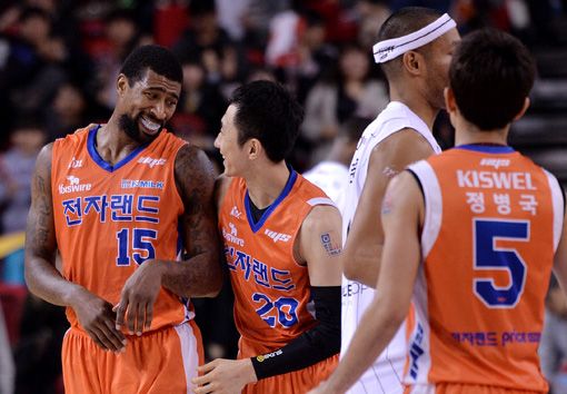 [아시아경제 이종길 기자]인천 전자랜드가 5연승을 질주, 중위권 경쟁에서 유지한 고지를 점했다. 인천삼산월드체육관에서 27일 열린 2014-2015 KCC 프로농구 정규리그 경기에서 창원 LG를 78-74로 이겼다. 시즌 여덟 번째 승리(10패)로 부산 KT(8승11패)를 밀어내고 단독 5위에 자리했다. 반면 LG는 시즌 열두 번째 패배(7승)와 함께 8위로 내려갔다. 팔꿈치를 다쳤던 데이본 제퍼슨이 12득점 9리바운드로 부활의 조짐을 보였으나 시종일관 리카르도 포웰의 맹폭을 막지 못했다. 25분16초 동안 32득점 12리바운드로 골밑을 지배당했다. 결정타도 그에게 맞았다. 70-66으로 앞선 종료 2분여 전 김종규를 앞에 두고 원 핸드 덩크슛을 꽂아 전자랜드에 승기를 안겼다. LG는 1분여 뒤 파울 작전을 꺼냈으나 승부를 뒤집기에 역부족했다. 종료 15초를 남기고 문태종이 3점슛을 성공시켜 3점차(72-75)로 따라붙었지만 정병국이 이어진 자유투 네 개 가운데 세 개를 넣어 그대로 주저앉았다. 전자랜드는 정영삼이 11득점, 정병국이 10득점으로 포웰의 부담을 덜어줬다. 테렌스 레더도 8득점 9리바운드로 골밑에서 제 몫을 했다. LG는 크리스 메시의 더블더블(11득점 13리바운드) 활약에 김종규(16점), 김영환(14점), 문태종(13점) 등이 두 자릿수 득점을 보탰지만 야투성공률(41%)이 고르지 못했다. 수비에서도 포웰의 잇단 활약에 기세가 눌리며 원활한 협력을 선보이지 못했다.리카르도 포웰(왼쪽)과 정영삼(가운데)[사진=김현민 기자]