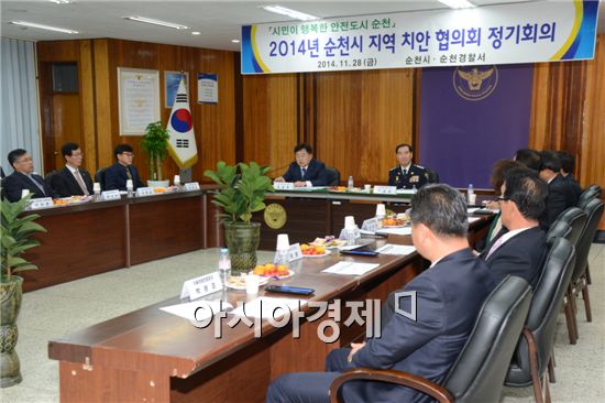 순천시와 순천경찰서는 28일 순천경찰서 팔마마루에서 ‘순천시 지역치안 협의회 정기회의’를 개최했다.<br />