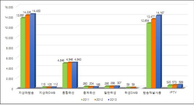 ▲지상파와 종합유선, PP 등의 방송산업 직원 현황.[사진제공=미래부]