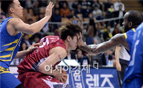 프로농구 LG의 기둥, 김종규(23)는 1일 열리는 모비스와의 창원 홈경기에 출전하지 않는다. KCC와의 홈경기(11월 29일)에서 오른쪽 발목을 다쳤다. 언제 경기에 나갈 수 있을지 알 수 없다. 병원에서 X-선 검사를 한 결과 뼈에는 이상이 없었다. 그러나 근육과 인대를 확인하기 위해 정밀진단을 받아야 한다. 김종규는 ‘높이’와 ‘빠르기’를 모두 갖춘 국가대표 센터다. 지난 시즌 LG가 창단 이후 첫 정규리그 우승을 하는 데 큰 몫을 했다. 올시즌에도 경기당 30분 13초를 뛰며 12.9득점, 6리바운드를 기록하고 있다. 특히 최근 여섯 경기에서 18.8득점, 5.2리바운드에 야투 성공률 59.0%를 기록하는 상승세를 보였다.김종규의 부상은 강행군의 후유증이다. 그는 인천아시안게임이 끝난 지 일주일 만인 10월 9일 팀에 복귀했고, 경기당 30분 이상 뛰었다. 골밑 선수로서 외국인 선수와 자주 격돌하기 때문에 체력 소모가 극심하고 부상 위험이 컸다. 사진은 지난달 24일 삼성과의 잠실 경기. 삼성의 리오 라이온스(27)가 수비를 하다 김종규의 얼굴을 쳤다. 김종규는 큰 충격을 받았다. 그가 경기를 할 때는 이런 장면이 자주 나온다.김현민 기자 kimhyun81@asiae.co.kr<ⓒ세계를 보는 창 경제를 보는 눈, 아시아경제(www.asiae.co.kr) 무단전재 배포금지>