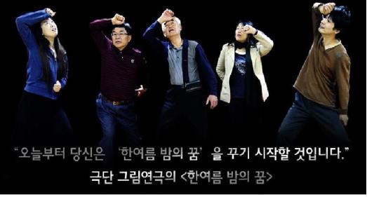 연기지도를 담당한 김영아 한국외대 교수는 “최근 일반인들의 예술참여가 활성화되면서 사회적으로 긍정적 효과를 낳고 있다. 특별한 사람들만의 전유물이 아닌 누구나 참여할 수 있는 열린 예술로 거듭나는데 있어 이번 연극이 조금이나마 기여하길 바란다”며 “특히 8살 어린이부터 이순을 넘긴 어르신까지 다양한 연령대가 참가한 만큼 세대가 함께 공감하는 자리가 될 것으로 내다보고 있다”고 말했다. 셰익스피어 5대 희극 중 하나로 꼽히는 이번 작품은 탄생 450주년을 기념, 추진됐다. 여기에 시민배우들의 상상력이 더해져 제목만큼이나 신비롭고 환상적인 무대를 연출할 예정이다. 블랙씨어터와 인형, 영상, 서커스 등 다양한 시청각적 표현기법들을 활용해 색다른 볼거리를 제공한다. 공연은 무료로, 총 6회에 걸쳐 진행된다. 2~5일 오후 7시 열린다.4~5일에는 낮 2시에도 일정이 잡혀 있다. 송파구 문화체육과(2147-2810)나 극단 그림연극(412-3883)으로 문의하면 된다. 박종일 기자 dream@asiae.co.kr<ⓒ세계를 보는 창 경제를 보는 눈, 아시아경제(www.asiae.co.kr) 무단전재 배포금지>