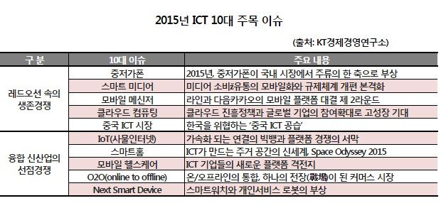 [아시아경제 권용민 기자] 2015년은 중저가폰·스마트 미디어·모바일 메신저 등이 주요 이슈로 주목될 전망이다.3일 KT 경제경영연구소는 '2015년 ICT 10대 주목 이슈' 특집보고서를 발간하고, 2015년을 '경쟁 패러다임의 새로운 전환기'로 규정했다. 보고서는 레드오션 단계로 접어들고 있는 기존 스마트 시장은 생존경쟁이 가속화 되고 융합시장은 신산업 선점 경쟁이 본격화되는 시기가 될 것으로 분석했다.보고서가 선정한 10가지 이슈는 ▲중저가폰 ▲스마트 미디어 ▲모바일 메신저 ▲클라우드 컴퓨팅 ▲중국 ICT 시장 ▲IoT(사물인터넷) ▲스마트홈 ▲모바일 헬스케어 ▲O2O(online to offline) ▲넥스트 스마트 디바이스(Next Smart Device)다. 2015년 ICT 10대 주목 이슈 보고서 전문은 KT경제경영연구소가 운영하는 지식포털 사이트 디지에코(www.digieco.co.kr)에서 내려받아 볼 수 있다.권용민 기자 festym@asiae.co.kr<ⓒ세계를 보는 창 경제를 보는 눈, 아시아경제(www.asiae.co.kr) 무단전재 배포금지>