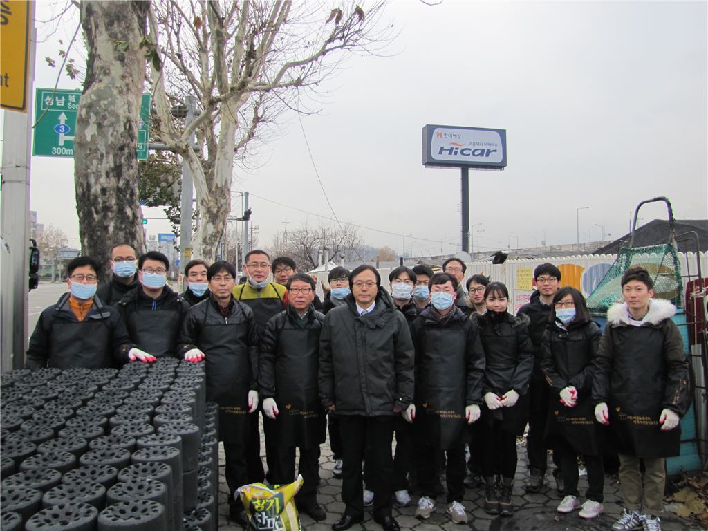 3일 유인상 한국주택협회 상근부회장(가운데)을 비롯한 한국주택협회 임직원들이 서울 장지동 화훼마을에서 연탄 배달행사에 앞서 기념사진을 찍고 있다.