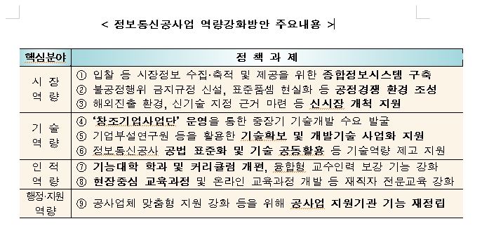 해외파트너 기업 확보 등 그동안 정보통신공사업 해외진출에 걸림돌이 되어 온 업계 애로사항을 해소할 수 있도록 코트라(KOTRA) 등 관련기관과 협력해 정보통신공사업 해외진출을 지원한다.정보통신공사의 기술 고도화 및 인터넷신산업 관련 신공법의 기술수요 분석을 실시하여 체계적인 기술개발 토대를 마련한다.발굴된 필요 기술 확보도 지원한다. 지정 신기술을 기반으로 해당 신기술이 적용된 제품ㆍ서비스가 시장에서 상용화될 수 있도록 사업화도 지원한다.중소 정보통신공사업체 경쟁력 향상 및 산업발전 도모를 위한 정보통신공사 표준공법ㆍ시방서 개발을 추진한다. 정보통신공사업의 성장기반 마련과 기술투자의 중복방지, 기술이전에 필수적인 공법ㆍ시방서의 표준화를 추진할 예정이다.아울러 정보통신기능대학을 활용해 미래 ICT 전문인력 양성을 추진하고 공사업체 재직자의 전문역량을 강화할 방침이다.미래부는 '정보통신공사업 역량강화 방안'의 착실한 이행과 공사업계의 노력이 어우러질 경우, 2017년까지 총 2조430억원의 추가 매출증대와 2만4200명의 신규 일자리가 창출될 것으로 기대하고 있다.이초희 기자 cho77love@asiae.co.kr<ⓒ세계를 보는 창 경제를 보는 눈, 아시아경제(www.asiae.co.kr) 무단전재 배포금지>