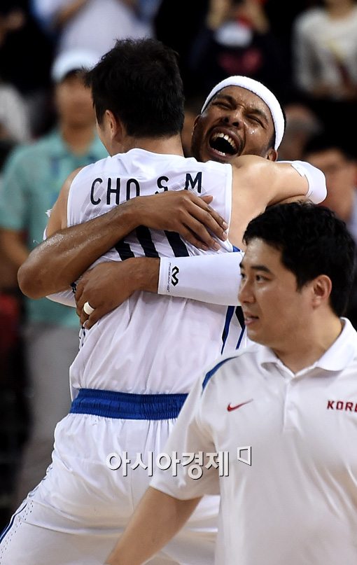 인천아시안게임 금메달을 이루고 기뻐하는 문태종(뒤)과 조성민[사진=김현민 기자]