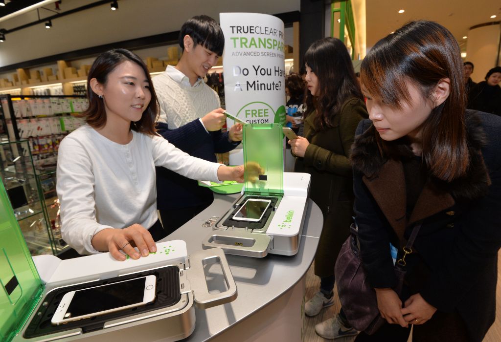 [아시아경제 최우창 기자] 한국벨킨이 7일 서울 잠실 롯데월드몰 반디앤루니스 매장에서 스마트폰 스크린 보호 및 케어를 위한 트루클리어 프로 어드밴스드 스크린 케어 론칭을 기념해 직원들이 시민들에게 무료 스크린 케어 서비스를 진행하고 있다.최우창 기자 smicer@asiae.co.kr<ⓒ세계를 보는 창 경제를 보는 눈, 아시아경제(www.asiae.co.kr) 무단전재 배포금지>