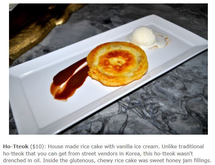 (출처 : 온라인커뮤니티)<해석>" '호떡(10달러)' : 바닐라 아이스크림과 함께 제공되는 가정식 쌀 케이크. 한국의 길거리에서 흔히 찾을 수 있는 전통적 '호떡'과 달리, 이 호떡은 기름에 튀겨 만들지 않았습니다. 안에는 달콤한 꿀 잼이 들어 있으며, 글루텐 성분으로 쫄깃함을 맛볼 수 있습니다."길거리에서 1000원에 파는 호떡이 바다를 건너가면 1만원? 최근 온라인 커뮤니티에서 화제가 된 사진입니다. 이 호떡 디저트는 음악인 겸 프로듀서인 박진영 JYP엔터테인먼트 대표가 지난 2012년 미국 뉴욕 맨해튼에서 개장한 고급 한식당 '크리스탈벨리'에서 실제로 판매되고 있는 메뉴입니다. 찾아보니 8일 현재 가격은 11달러로 사진보다 1달러 더 오른 상태네요.한 커뮤니티에서는 이 사진을 놓고 네티즌들의 다양한 의견이 오갔습니다. "10달러라니, 말도 안되게 비싼 가격이 아니냐"면서부터 "우리 고유 먹거리가 외국에 건너가 더 고급화되고 비싼 가격에 대접받지 못할 이유가 없다"는 주장, "비싼 건 이해하지만 아이스크림 하나만 얹어주는 건 좀 부실해 보인다"는 주장 등이 눈에 띄네요.온라인이슈팀 issue@asiae.co.kr<ⓒ세계를 보는 창 경제를 보는 눈, 아시아경제(www.asiae.co.kr) 무단전재 배포금지>