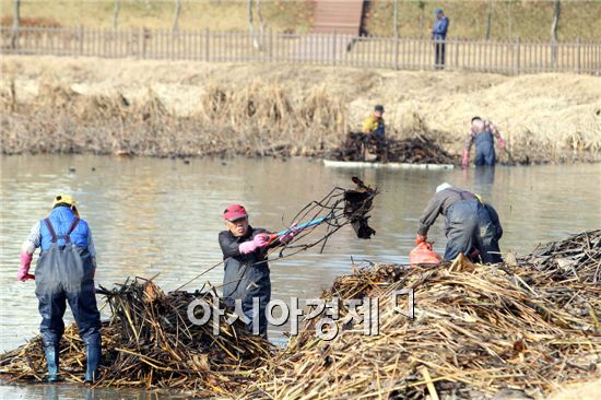 광주 북구청 공원녹지과 관계자들이 8일 양산동 본촌 근린공원인 양산제에서 산책로를 이용하는 주민들에게 쾌적한 환경을 제공하기 위해 연꽃 제거 작업을 하고 있다. 사진제공=광주시 북구<br />