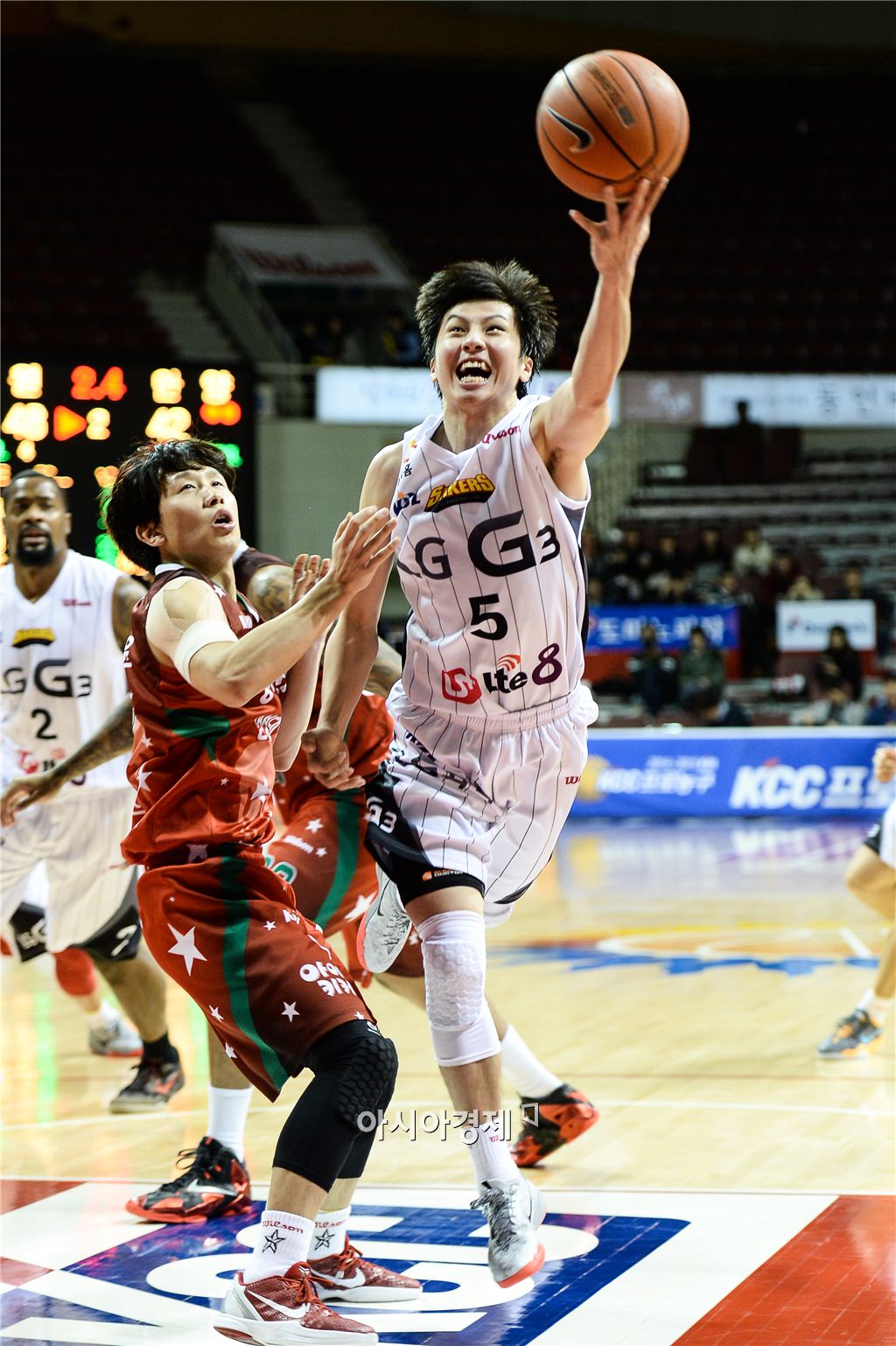 [안양=아시아경제 이종길 기자]창원 LG가 중위권 도약의 틀을 마련했다. 안양실내체육관에서 8일 열린 2014-2015 KCC 프로농구 정규리그 경기에서 안양 KGC인삼공사를 98-70으로 이겼다. 시즌 아홉 번째 승리(15패)로 7위 KGC(9승14패)와 승차를 0.5경기로 좁혔다. 김종규가 오른 발목을 다쳐 전력에서 제외됐지만 김시래의 공수 조율 아래 지난 시즌 정규리그 우승의 면모를 재현했다. 특히 48-42 리드 속에 맞은 3쿼터가 그랬다. 상대를 9점으로 묶으면서 28점을 넣어 사실상 승기를 굳혔다. 그 선봉장은 김시래. 3점슛 두 개를 꽂는 등 7득점했다. 김영환도 8점을 몰아넣으며 상승세에 힘을 보탰다. KGC는 계속된 맹공에 좀처럼 전열을 재정비하지 못했다. 이동남 KGC 감독대행은 "오세근, 강병현 등의 부상으로 젊은 선수들이 주축을 이루다 보니 한 번 침체된 흐름을 끊지 못했다"고 했다. 그는 "지난 6일 인천 전자랜드와 경기(54-64 패)에서 무리한 탓에 체력에서도 문제가 있었다"고 했다. KGC는 전반까지만 해도 LG와 대등하게 맞섰다. 양희종(10득점)과 전성현(12득점)의 외곽슛이 불을 뿜었고 골밑의 리온 윌리엄스(15득점 11리바운드), 애런 맥기(15득점 5리바운드)가 제 몫을 했다. 그러나 전반 종료를 앞두고 문태종에게 3점슛 두 개를 맞아 분위기가 급격히 가라앉았다. LG는 틈을 놓치지 않았다. 김시래(18득점 7도움)의 안정된 리드 속에 실수를 저지르던 데이본 제퍼슨(20득점 13리바운드)과 크리스 메시(13득점 7리바운드)가 안정을 되찾았다. 문태종(16득점), 김영환(11득점), 이지운(9득점)도 내외곽을 부지런히 뛰어다니며 다양한 공격 활로를 만들었다. 김진 LG 감독은 승리 요인으로 수비를 꼽았다. 특히 40-35로 앞선 리바운드를 칭찬했다. 그는 "작은 선수들까지 리바운드 경쟁에 적극적으로 가담했다. 김종규의 공백을 제대로 메운 것이 큰 도움이 됐다"고 했다. 그러면서 "김시래가 무리하지 않고 공격에서 강약을 잘 조절했다"며 "앞으로도 이런 집중력을 보인다면 반등에 큰 활력소가 될 것"이라고 했다. 김시래는 "김진 감독이 경기 전 공수 조율에 대해 많은 조언을 했다"며 "특히 수비에서 약하다는 얘기를 듣지 않기 위해 계속 악착같이 뛰겠다"고 했다.이종길 기자 leemean@asiae.co.kr<ⓒ세계를 보는 창 경제를 보는 눈, 아시아경제(www.asiae.co.kr) 무단전재 배포금지>