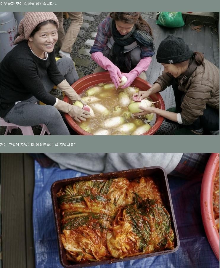 '소길댁' 이효리 "이웃들과 김장 담았어요"[아시아경제 온라인이슈팀] 가수 이효리가 최근 근황을 공개했다. 이효리는 8일 자신의 블로그에 여러장의 사진과 함께 최근 근황을 게재했다.공개된 사진 속에는 눈 덮인 제주의 모습과 함께 강아지들이 뛰놀고 있는 평화로운 일상이 담겨 있다. 또 다른 사진에서는 이효리가 이웃들과 함께 추운 날씨에 김장을 하고 있다. 마지막에는 김장을 다 한 사진을 보여줬다.또한 이효리는 "소길에는 며칠 눈이 많이 내렸고 그러다 무지개도 떠오르고 이웃들과 모여 김장을 담았습니다. 전 그렇게 지냈는데 여러분은 잘 지냈나요?"라며 인사말을 전했다.한편 이효리는 최근 자신의 텃발에서 키운 콩을 '소길댁 유기농 콩'이라는 이름으로 직거래 장터에서 판매하다 '유기농 인증' 논란에 휩싸인 후 공식 사과했다.이효리 김장 소식을 접한 네티즌은 "이효리 김장, 역시 요리 잘하네" "이효리 김장, 행복해보여" "이효리 김장, 소소하면서도 즐겁게 사는거 같아" "이효리 김장, 오랜만에 반갑네" "이효리 김장, 주부 다 됐네"등의 반응을 보였다.온라인이슈팀 issue@asiae.co.kr<ⓒ세계를 보는 창 경제를 보는 눈, 아시아경제(www.asiae.co.kr) 무단전재 배포금지>