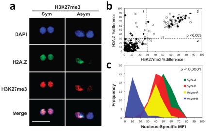 ▲생쥐 피부의 성체줄기세포. 딸세포 중 불멸 유전정보(H2A.Z)를 지닌 성체줄기세포의 핵에 H3K27me3 분자가 비대칭적으로 다량 분포돼 있다는 것을 확인할 수 있다.[사진제공=한국기초과학지원연구원]