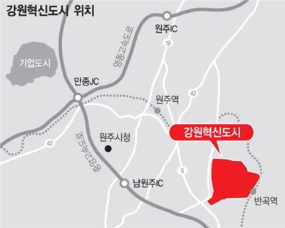 -총사업비 8910억원, 원주시 반곡동 일대 359만㎡-국과수·대한적십자사 등 12개 공공기관 이전[아시아경제 특별취재팀]강원혁신도시는 총사업비 8910억원을 들여 강원도 원주시 반곡동 일대 359만여㎡에 조성된다. 2008년 3월 첫 삽을 뜬 이후 부지조성 공사 공정률이 현재 97%에 이르고 있다. 공사가 완료된 후 도시가 제 모습을 갖추면 3만1000여명의 인구가 유입될 것으로 전망된다. 강원혁신도시는 국가균형발전을 이루면서 중부권역의 성장 거점도시를 육성하기 위해 추진됐다. 특히 생명ㆍ건강과 관광 등과 관련된 공공기관은 물론 연관기업을 집중적으로 육성해 강원도의 새로운 성장동력이 되게 하겠다는 목표를 세워놓고 있다. 현재는 해당 사업과 관련성이 큰 12개 공공기관들이 강원혁신도시로 이전했거나 이전할 준비를 하고 있다. 이미 국립과학수사연구원, 한국보훈복지의료공단, 대한적십자사, 대한석탄공사 4개 기관이 이전을 완료한 상태다. 한국관광공사는 이달 말까지 이전하게 된다. 국민건강보험공단과 건강보험심사평가원 등 나머지 7개 기관도 내년 말까지는 모두 이전하는 것으로 계획돼 있다. 강원도와 원주시는 혁신도시 건설로 인한 지역발전 기대효과가 클 것으로 기대한다. 우선 12개 공공기관 이전에 따른 직원들과 부양가족, 직간접 고용 및 인구 유입효과 등으로 최소 3만여명 이상의 인구가 도내로 유입될 것으로 예상한다. 공공기관과 연관된 기업 및 연구소가 납부할 지방세의 수입 증가는 원주시 재정 확충에 크게 기여할 것이란 기대가 크다. 혁신도시로 이전하는 공공기관은 도내 대학과 기업 및 연구소 등과 협력을 통해 산학연 클러스터를 조성하고 새로운 기업 생태계를 창조할 계획이다. 이 과정에서 공공기관, 대학, 기업 및 연구소 등이 우수한 인력을 필요로 하기 때문에 지방대학 및 지역 내 연구, 교육기관의 질적 향상도 기대된다. 원주시는 혁신도시를 기반으로 인구 40만명의 중부내륙 거점도시로의 성장을 기대하고 있다. 권명회 원주시청 미래도시개발과장은 "혁신도시 건설에 따른 지역발전 효과를 극대화하기 위해서는 공공기관뿐만 아니라 관련 기업 및 연구소, 대학 등의 유치가 관건"이라며 "중앙정부, 강원도와 긴밀히 협의해 최대한 끌어오도록 할 계획"이라고 설명했다.특별취재팀