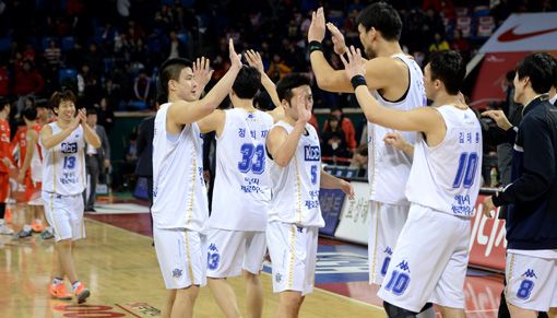 [아시아경제 김현민 기자] 프로농구 서울 SK와 전주 KCC의 경기가 9일 서울 잠실학생체육관에서 열렸다. 82-72로 승리를 거둔 KCC 선수들이 기뻐하고 있다.김현민 기자 kimhyun81@asiae.co.kr<ⓒ세계를 보는 창 경제를 보는 눈, 아시아경제(www.asiae.co.kr) 무단전재 배포금지>