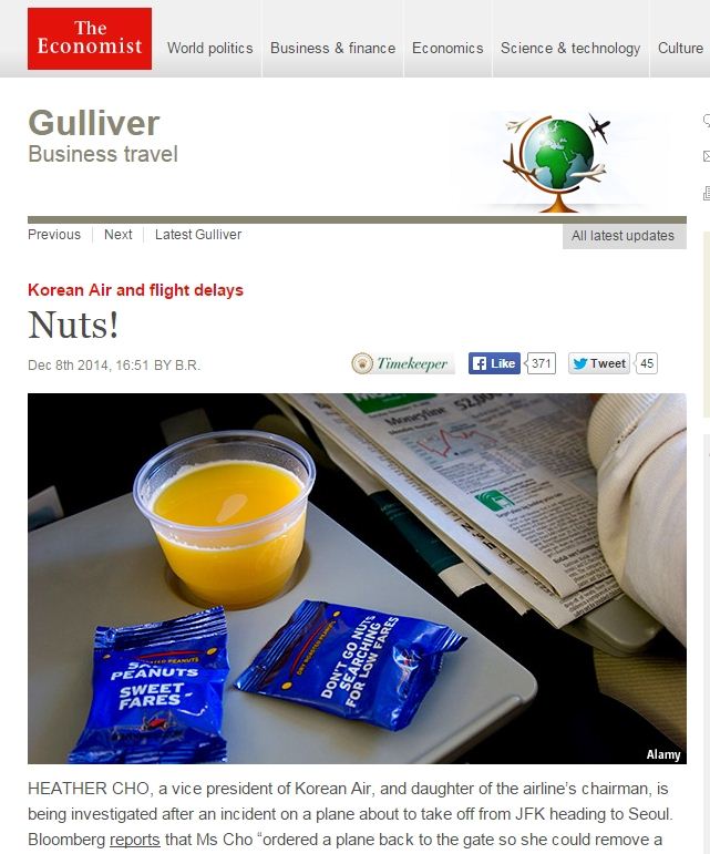 조현아 전 대한항공 부사장 사건을 다룬 영국 이코노미스트 온라인판 기사. 사진=이코노미스트 사이트 캡처