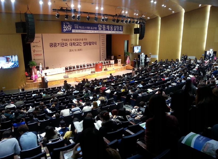 ▲국토교통부는 지난 10월28일 강원도 원주시 연세대학교 원주캠퍼스 정의관 대강당에서 '원주혁신도시 이전공공기관 채용설명회'를 개최했다. 이날 채용설명회에는 건강보험심사평가원, 국립공원관리공단, 대한적십자사, 도로교통공단 등 이전 공공기관 9곳은 강원지역 16개 대학교와 인재육성 및 채용활성화를 위한 업무협약(MOU)을 체결했다.