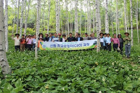 한국산림아카데미CEO과정 5기 수강생들이 강원도 산림환경연구소 산마늘농장에서 현장실습을 하고 기념사진을 찍고 있다.