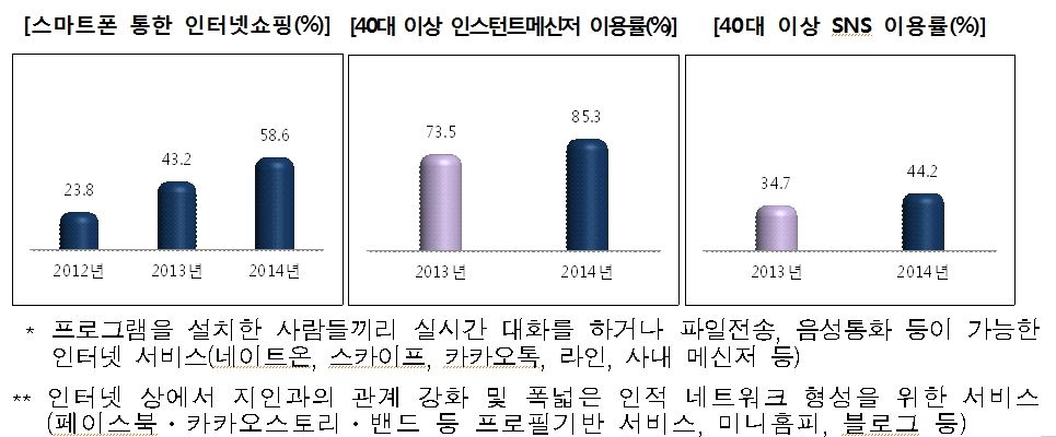 특히 중장년층의 스마트폰 활용도가 높아지면서 타 연령층에 비해 40대 이상의 메신저 이용률이 상승하고 있는 것으로 조사됐다.SNS 이용률은 전년 대비 다소 늘었다. 지난해 55.1%에서 60.7%로 증가했다. 특히 인스턴트 메신저와 마찬가지로 40대 이상의 상승 폭이 높게 나타났다.SNS 중 가장 이용률이 높은 유형은 카카오스토리, 네이버 밴드, 페이스북 등 프로필 기반 서비스(95.0%)인 것으로 나타났다. 그 다음으로는 카페, 클럽 등 커뮤니티(31.5%), 트위터 등 마이크로 블로그, 미니홈피 등의 순으로 조사됐다.인터넷쇼핑 이용률은 51.3%로, 여성(57.1%)이 남성(46.0%)보다 인터넷쇼핑을 더 많이 이용하는 것으로 나타났다. 인터넷쇼핑 시 주로 사용하는 기기는 데스크톱 컴퓨터로 전년 86.2%에서 81.4%로 하락했다. 반면 스마트폰을 통한 인터넷쇼핑 이용률은 전년 43.2%에서 58.6%로 늘어 최근 3년간 2.5배로 나타났다.이번 조사는 전국 2만5000가구 및 만 3세 이상 가구원을 대상으로 7월16일부터 9월30일까지 전국 17개 시도의 가구를 방문해 면접하는 방식으로 진행됐다. 미래부는 1999년부터 인터넷 이용자 수 산출을 위한 연구를 시작, 2003년 국가승인통계(지정통계 제12005호) 지정해 매년 1회 본 조사를 실시하고 있다.정한근 미래부 인터넷정책관은 "스마트기기 등을 통한 모바일 인터넷 서비스 이용이 전 연령층에 보편화되고 있음을 확인할 수 있었다"면서 "전 세계 인터넷 서비스가 모바일로 급속하게 재편되는 만큼 세계 최고 수준의 정보통신기술(ICT) 인프라와 단말기 경쟁력을 확보한 우리나라가 모바일시대의 패러다임을 주도할 수 있도록 규제 개선을 비롯한 다양한 인터넷 비즈니스 활성화 정책을 지원하고 인터넷 접속품질과 안정성 강화를 위해 노력하겠다"고 밝혔다.이번 조사 결과는 미래부 홈페이지(www.msip.go.kr) 및 KISA 인터넷통계정보검색시스템(isis.kisa.or.kr) 홈페이지에서 다운받을 수 있다. 이초희 기자 cho77love@asiae.co.kr<ⓒ세계를 보는 창 경제를 보는 눈, 아시아경제(www.asiae.co.kr) 무단전재 배포금지>