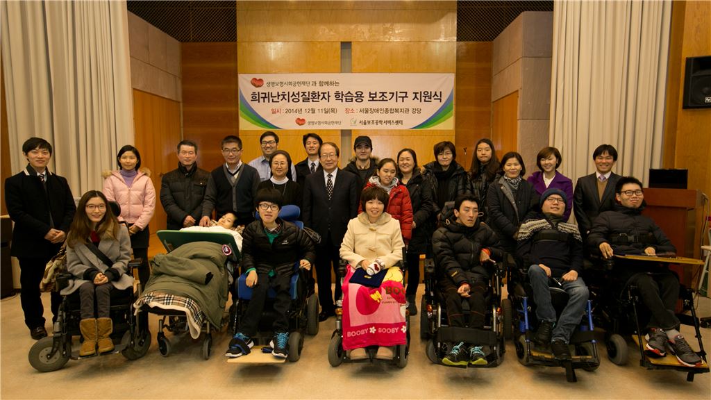 생명보험사회공헌재단 관계자와 희귀난치성질환 학생 및 가족 등이 서울장애인종합복지관에서 학습용 보조기기 지원식을 갖고 기념촬영을 하고 있다.
