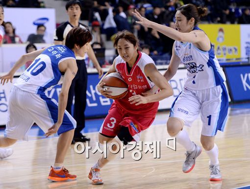[용인=아시아경제 김현민 기자] 2014-2015 여자프로농구 삼성과 KDB생명의 경기가 12일 용인실내체육관에서 열렸다. KDB생명 김진영이 상대 박하나와 고아라의 수비를 뚫고 공격하고 있다.김현민 기자 kimhyun81@asiae.co.kr<ⓒ세계를 보는 창 경제를 보는 눈, 아시아경제(www.asiae.co.kr) 무단전재 배포금지>