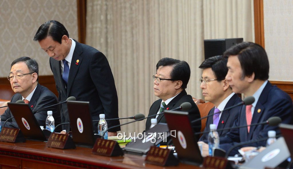 [아시아경제 백소아 기자] 박인용 국민안전처 장관(왼쪽부터 두 번째)이 16일 서울 세종로 정부서울청사에서 열린 국무회의에 첫 참석해 인사를 하고 있다. (왼쪽부터)최성준 방송통신위원장, 박 장관, 이동필 농림축산식품부 장관, 황교안 법무부 장관, 윤병세 외교부 장관백소아 기자 sharp2046@asiae.co.kr<ⓒ세계를 보는 창 경제를 보는 눈, 아시아경제(www.asiae.co.kr) 무단전재 배포금지>