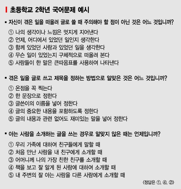 문항의 의도는 '멋지게 지어내는 일'은 글을 객관적으로 쓰는 데 맞지 않다는 뜻으로 보이지만 구체적 상황을 주지도 않고 '나의 생각이나 느낌'을 쓸 때 '멋지게' 쓰면 안 된다고 하는 것은, 스스로 느낀 것에 의미를 부여하고 상상력을 입히면 안 된다는 인식을 심어줄 수 있다는 지적이 나온다. 이 시험지를 올린 학부모는 "자신이 겪은 일을 떠올려 글을 쓸 때 (생각에) 살을 붙이고, 상상을 하면서 더 풍성하게 만드는 것"이라며 "이런 시험문제로 아이들의 생각에 자질구레한 틀을 들이 대면 글을 쓰고자 하는 동기가 생기지 않을 것"이라고 비판했다. 이 밖에 '겪은 일을 글로 쓰고 제목을 정하는 방법으로 알맞은 것'을 고르는 문제의 정답은 '글의 중요한 내용을 포함하도록 정한다'인데, 나머지 선택지도 어린 학생들이 자유롭게 제목을 정하는 데 있어 왜 문제가 되는지 명확하지 않다. '온점을 꼭 찍는다' '한 문장으로 정한다' '글쓴이의 이름을 넣어 정한다' 등의 선택지는 오답 처리됐다. '아는 사람을 소개하는 글을 쓰는 경우로 알맞지 않은 때'를 고르는 문제도 논란이다. 정답이 '처음 만난 사람을 내 친구에게 소개할 때'인 이 문제의 출제 의도는 '아는' 사람이라는 점에 있는 것으로 추정되지만 '처음 만나도 얘기를 많이 들어 꽤 알게 된 사람일 수도 있고, 처음 만났으나 짧은 시간에도 잘 알게 돼 충분히 소개하고 싶은 사람'일 수도 있다는 지적이 나오고 있다. 이 같은 지적에 학부모들은 대체로 공감을 나타내고 있다. 실제로 초등학교 1·2학년에 다니는 자녀를 둔 학부모들은 이 같은 유형의 문제 때문에 자녀를 이해시키기 난감했던 적이 많았다고 토로한다. 서울 강서구에 사는 한 학부모는 "문제가 원하는 답을 맞히려면 예습이 필요하다"며 "답지를 보고 설명해줘야 할 정도로 어른들도 출제자의 의도를 한 번에 이해하기 어렵다"고 말했다. 일부에선 '평가'가 불가피한 교육 체제 안에서 '출제자의 의도'를 파악하는 과정이 시험이라는 것 또한 배워야 한다는 의견도 나오지만 상대적으로 소수에 그치고 있다. 문항의 잘잘못을 떠나, 초등학교 저학년에게까지 지필평가를 치르게 하는 것은 바람직하지 않다는 데는 대체로 의견이 모아지고 있다. 인천에 거주하는 한 학부모는 "창의력을 키워주겠다고 교과과정을 바꿔놓고 시험은 아직도 기존 수준을 벗어나지 못하는 학교가 많다"며 "우리 아이가 다니는 학교는 주관식 문항만으로 평가하는데, 문제를 읽지 않은 엉뚱한 답이 아니라면 교사가 모두 만점을 주는 걸 보고 1학년에 적절한 평가방법이라는 생각이 들었다"고 말했다. 현재 초등학교의 경우 학교 전체가 일시에 보는 지필평가는 사실상 폐지됐으나 단원평가나 월말평가 등의 이름으로 반별로 시험이 자율적으로 치러지기도 한다. 시험성적이 학교생활기록부에 반영되지는 않지만 학생과 학부모에게는 엄연한 '평가'로 인식돼 적지 않은 부담이 되고 있다. 오정희 서울 상현초등학교 교사는 "교과서의 경우에도 간혹 주관식 문제를 내놓고 책 뒤에 '정답'으로 제시된 몇 가지 답안을 오려 붙이도록 하는 경우가 있는데, 이때는 차라리 답지를 무시하고 아이들이 자유롭게 토론하도록 유도한다"며 "1·2학년에게 지필평가보다는 생각을 다양하게 열어주는 수행평가 방식이 바람직할 것"이라고 말했다.이윤주 기자 sayyunju@asiae.co.kr<ⓒ세계를 보는 창 경제를 보는 눈, 아시아경제(www.asiae.co.kr) 무단전재 배포금지>