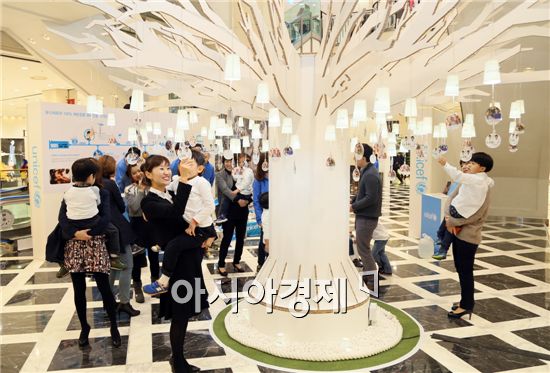 연말연시를 맞아 (주)광주신세계(대표이사 유신열)가 1층 컬쳐스퀘에어 마련한 '유니세프(unicef) 전시관'에서 국제 아동들에게 희망을 전달하기 위해 직접 손 글씨로 쓴 응원메세지를 희망트리에 매달고 있다. 사진제공=광주신세계<br /> <br /> <br />