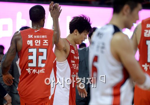 [아시아경제 김현민 기자] 프로농구 서울 SK와 울산 모비스의 경기가 17일 잠실학생체육관에서 열렸다. SK 박상오가 공격 리바운드와 상대 함지훈의 5반칙 퇴장을 이끌어낸 뒤 동료들과 하이파이브하고 있다. 김현민 기자 kimhyun81@asiae.co.kr<ⓒ세계를 보는 창 경제를 보는 눈, 아시아경제(www.asiae.co.kr) 무단전재 배포금지>