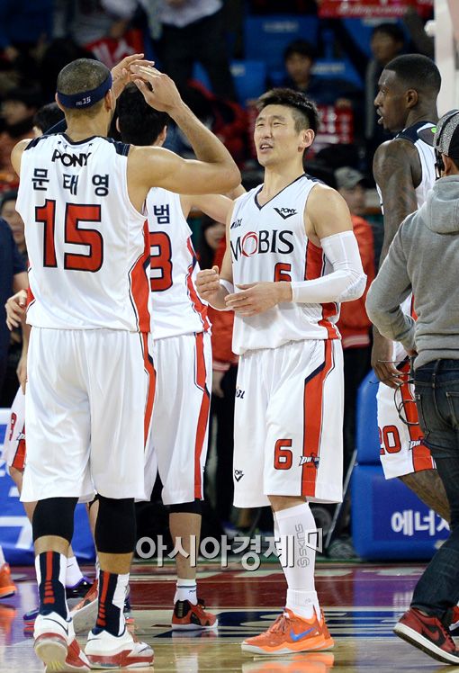 [아시아경제 김현민 기자] 프로농구 서울 SK와 울산 모비스의 경기가 17일 잠실학생체육관에서 열렸다. 89-88로 짜릿한 한 점차 승리를 거둔 모비스 양동근이 문태종과 기쁨을 나누고 있다. 김현민 기자 kimhyun81@asiae.co.kr<ⓒ세계를 보는 창 경제를 보는 눈, 아시아경제(www.asiae.co.kr) 무단전재 배포금지>