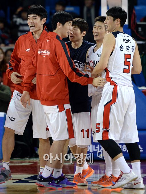 [아시아경제 김현민 기자] 프로농구 서울 SK와 울산 모비스의 경기가 17일 잠실학생체육관에서 열렸다. 89-88로 짜릿한 한 점차 승리를 거둔 모비스 양동근이 동료들과 기쁨을 나누고 있다. 김현민 기자 kimhyun81@asiae.co.kr<ⓒ세계를 보는 창 경제를 보는 눈, 아시아경제(www.asiae.co.kr) 무단전재 배포금지>
