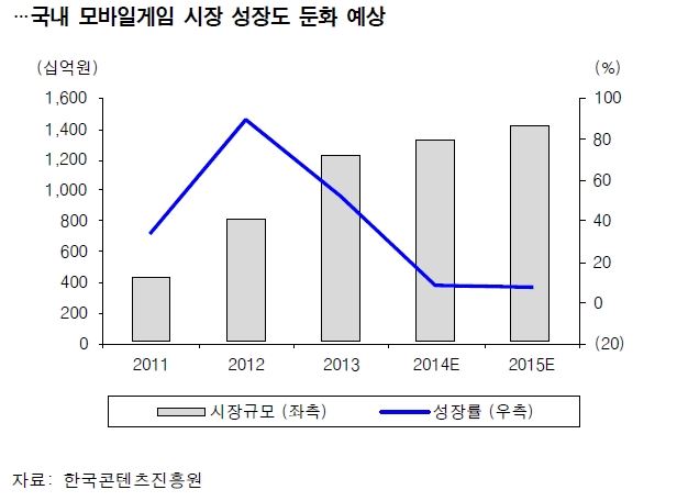 국내 스마트폰 보급률 둔화로 모바일게임 성장세 줄어들 것해외시장은 여전히 고성장…특히 중국 내년 50% 급성장해외공략 관건인 국내사들 인기높은 RPG로 승부걸어야[아시아경제 이초희 기자]내년 중국 모바일게임 시장이 올해보다 50%이상 성장할 것이라는 전망이다. 특히 역할수행게임(RPG)의 인기가 높아 국내 게임사들이 차별화된 RPG로 중국 시장 공략에 나설 것으로 보인다.18일 관련업계에 따르면 국내 스마트폰 보급률 성장이 둔화되며 국내 모바일게임 시장도 성장이 둔화되고 있다. 한국콘텐츠진흥원은 2014년 국내 모바일게임 시장 성장률이 8%대에 그치며, 2015년에도 한자리대의 성장률에 그칠 것으로 내다보고 있다. 반면, 국내시장보다 20배 이상 큰 글로벌 모바일게임 시장의 경우 신흥 국가의 스마트폰 보급률 상승 여력이 여전히 높아 2017년까지 20% 이상의 고성장이 예상된다. 특히 세계에서 두번째로 큰 시장을 형성하고 있는 중국의 경우 2015년에도 50% 이상의 높은 성장세가 이어질 것으로 예상된다. 오동환 삼성증권 연구원은 "국내 모바일게임 업체들의 지속적 성장을 위해서는 글로벌 시장 진출이 불가피할 전망이며, 글로벌 시장에서의 성공 가능성이 핵심경쟁력이 될 것"이라고 예상했다.특히 온라인 다중접속역할수행게임(MMORPG)의 인기가 높은 한국과 중국에서 모바일 RPG 장르의 인기가 점차 상승할 것이라는 전망이다.오 연구원은 "학습효과로 점차 정교하고 고도화된 게임에 대한 수요가 증가했고 가입자당 매출(ARPU)이 높은데다 라이프사이클이 긴 RPG 장르의 특성으로 퍼블리셔들 또한 RPG 게임 개발에 열을 올리고 있기 때문"이라고 설명했다.(자료-삼성증권)