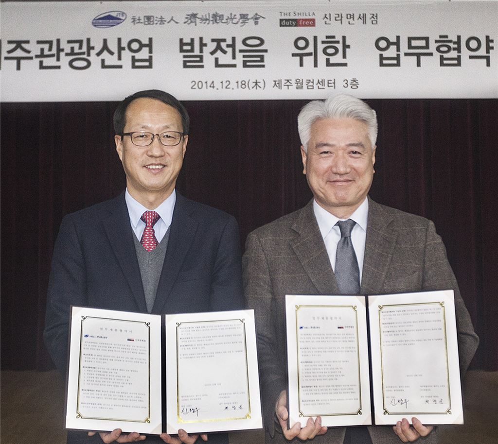 제주관광학회와 호텔신라는 이달 18일 제주시 연동 제주웰컴센터에서 제주관광산업 발전을 위한 업무협약을 체결한 후 기념촬영을 하고 있다. 호텔신라 최광순 제주신라면세점장(왼쪽), 제주관광학회 신왕우 학회장<br /> <br />