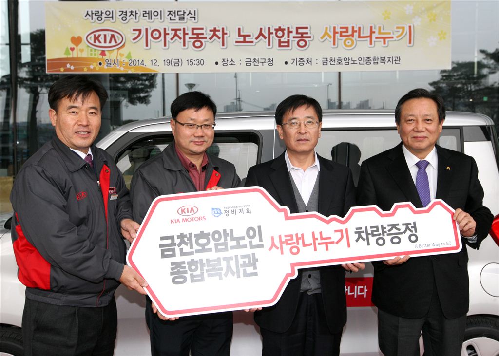 [아시아경제 박종일 기자] 금천구(구청장 차성수) 19일 오후 3시30분 금천구청 앞 광장에서 기아자동차가 후원하는 '사랑의 경차' 전달식을 가졌다. 이날 전달식에는 차성수 금천구청장, 조영표 금천호암노인종합복지관장, 기아자동차시흥서비스센터장 외 4명과 관계자들이 참석했다. 기아자동차측은 사회공헌 일환으로 사랑의 경차 '레이'(가액 1261만원)를 금천구 사회복지단체인 금천구립호암노인종합복지관에 기증했다. 전달식에 이어 구청장과 복지관장이 시승하는 행사도 이어졌다. 박종일 기자 dream@asiae.co.kr<ⓒ세계를 보는 창 경제를 보는 눈, 아시아경제(www.asiae.co.kr) 무단전재 배포금지>
