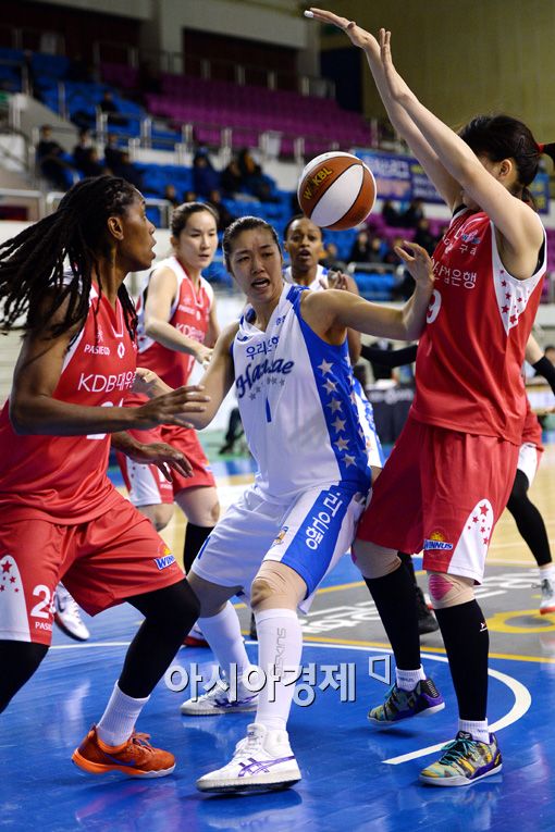 [춘천=아시아경제 김현민 기자] 여자 프로농구 우리은행과 KDB생명의 경기가 19일 춘천호반체육관에서 열렸다. 우리은행 양지희가 상대 수비에 막혀 고전하고 있다. 김현민 기자 kimhyun81@asiae.co.kr<ⓒ세계를 보는 창 경제를 보는 눈, 아시아경제(www.asiae.co.kr) 무단전재 배포금지>