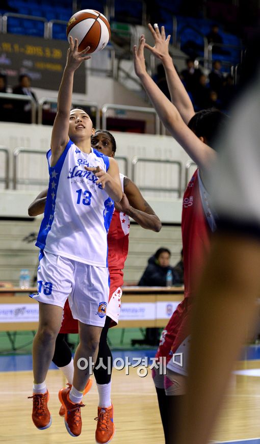 [춘천=아시아경제 김현민 기자] 여자 프로농구 우리은행과 KDB생명의 경기가 19일 춘천호반체육관에서 열렸다. 우리은행 이승아가 상대 김소담의 수비를 뚫고 공격하고 있다. 김현민 기자 kimhyun81@asiae.co.kr<ⓒ세계를 보는 창 경제를 보는 눈, 아시아경제(www.asiae.co.kr) 무단전재 배포금지>